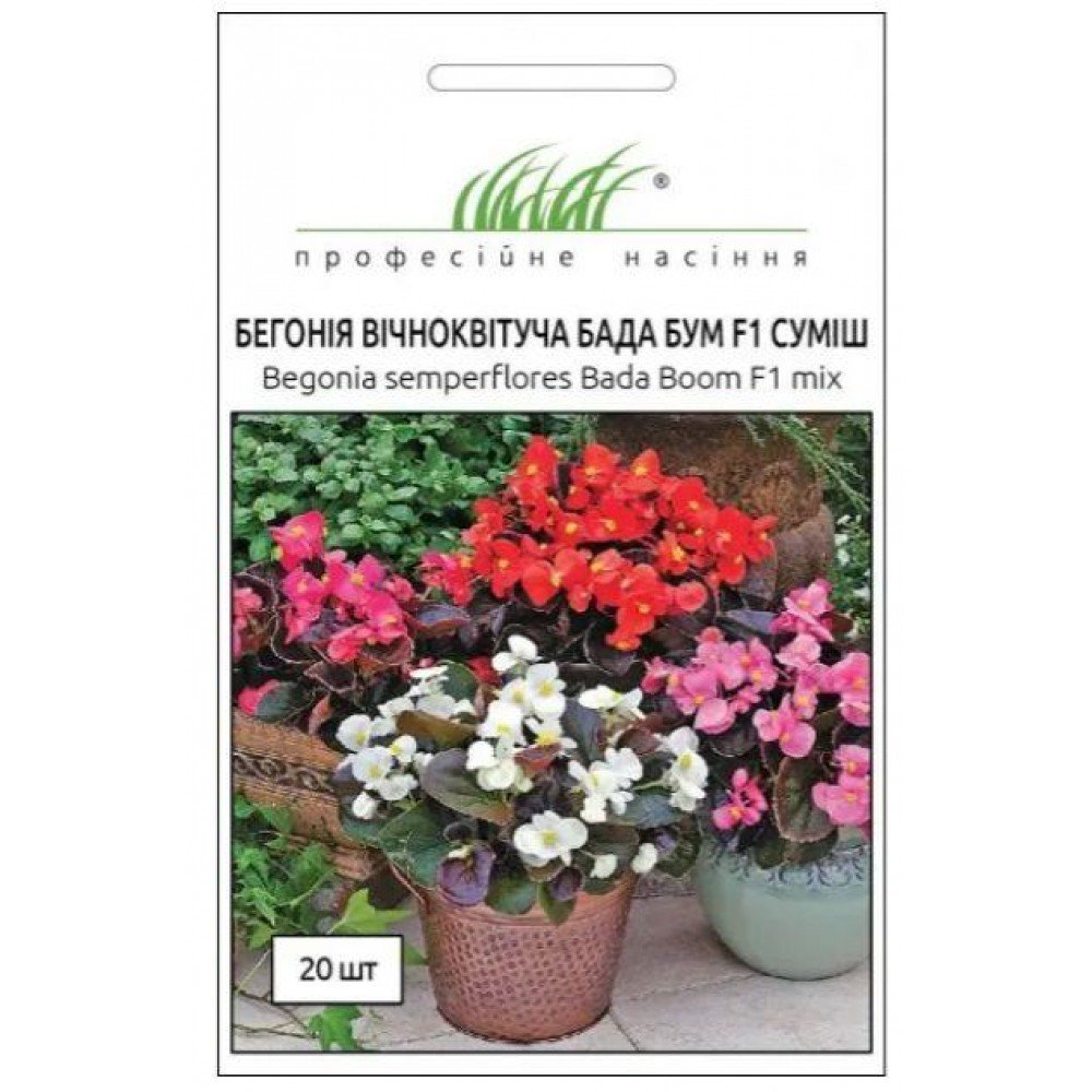 Бегонія Бада Бум F1 - безперечно красива суміш насіння яка вражає своєю ніжністю. Саджанці бегоній даного сорту відноситься до гібридного типу висота яких досягає 25 см. Даний сорт відзначається досить красивим червоно-зеленим забарвленням круглих листків. Квіти даного сорту відзначаються яскравим цвітінням яке Ви можете спостерігати влітку, а також висадивши у горщики які дозволять милуватись цими прекрасними квітами на Ваших підвіконнях. Бегонія Бада Бум відноситься до тепло та світлолюбних рослин при вирощуванні полюбляє помірне зволоження. Посіви насіння проводиться з грудня по березень висадивши у добре родючий, пухкий грунт. Після висіву грунт рекомендується обприскувати та накривати склом або плівкою. Перші сходи з'являються через 14 днів з температурою повітря 19-20 С. Розсаду можна висаджувати у відкритий грунт після того як мине загроза заморозків.