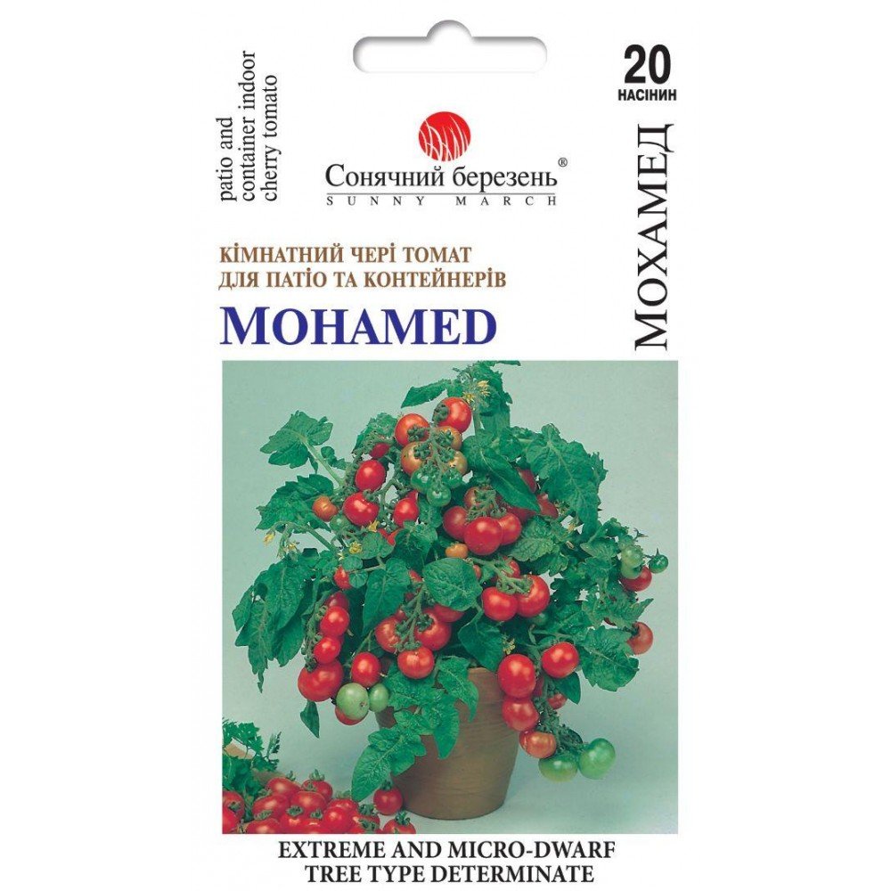 Мохамед-найраніший, найсолодший і найсмачніший ультракомпактний помідор з нашої колекції. Кімнатна міні-карликова рослина висотою менше 30 см., із щільно зімкнутим рясним листям через 45-55 днів після пересадки зав'язує яскраво-червоні вишневидні плоди в досить великій кількості для такого маленького томату. На гарних кистях одночасно дозріває по 6-8 плодів. Чудовий смачний помідор, що ідеально підходить для домашніх садів і відмінний вибір для додавання в салати або кулінарні творіння.