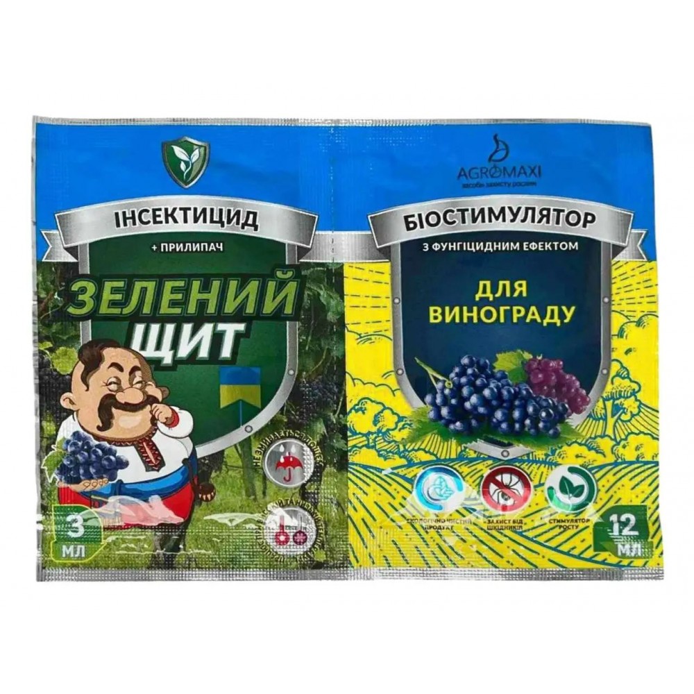 Препарат для Винограду Зелений Щит від ТМ Агромаксі – спеціально створений український інсектицид з м'якою фунгіцидною дією для обробки виноградників. Додатково збагачений комплексом добрив. Надійний захист винограду від ряду шкідників і комплексу хвороб. Один препарат зручно застосовувати в саду – всього 2 комплексних обприскування за сезон, замість безлічі окремих обробок. Добрива і діючі речовини, доповнені фітогормонами та стимуляторами – ви отримаєте здоровий виноградник, відмінний урожай і великі солодкі ягоди. І все це завдяки одному препарату.